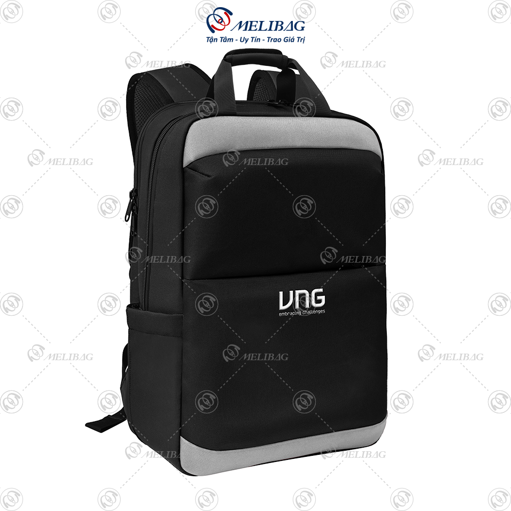 Balo quà tặng VNG sở hữu kiểu dáng gọn gàng, hiện đại và sang trọng. Phom dáng cứng cáp, màu đen chủ đạo kết hợp chi tiết xám nhã nhặn tạo nên sự hài hòa, phù hợp với nhiều đối tượng sử dụng.